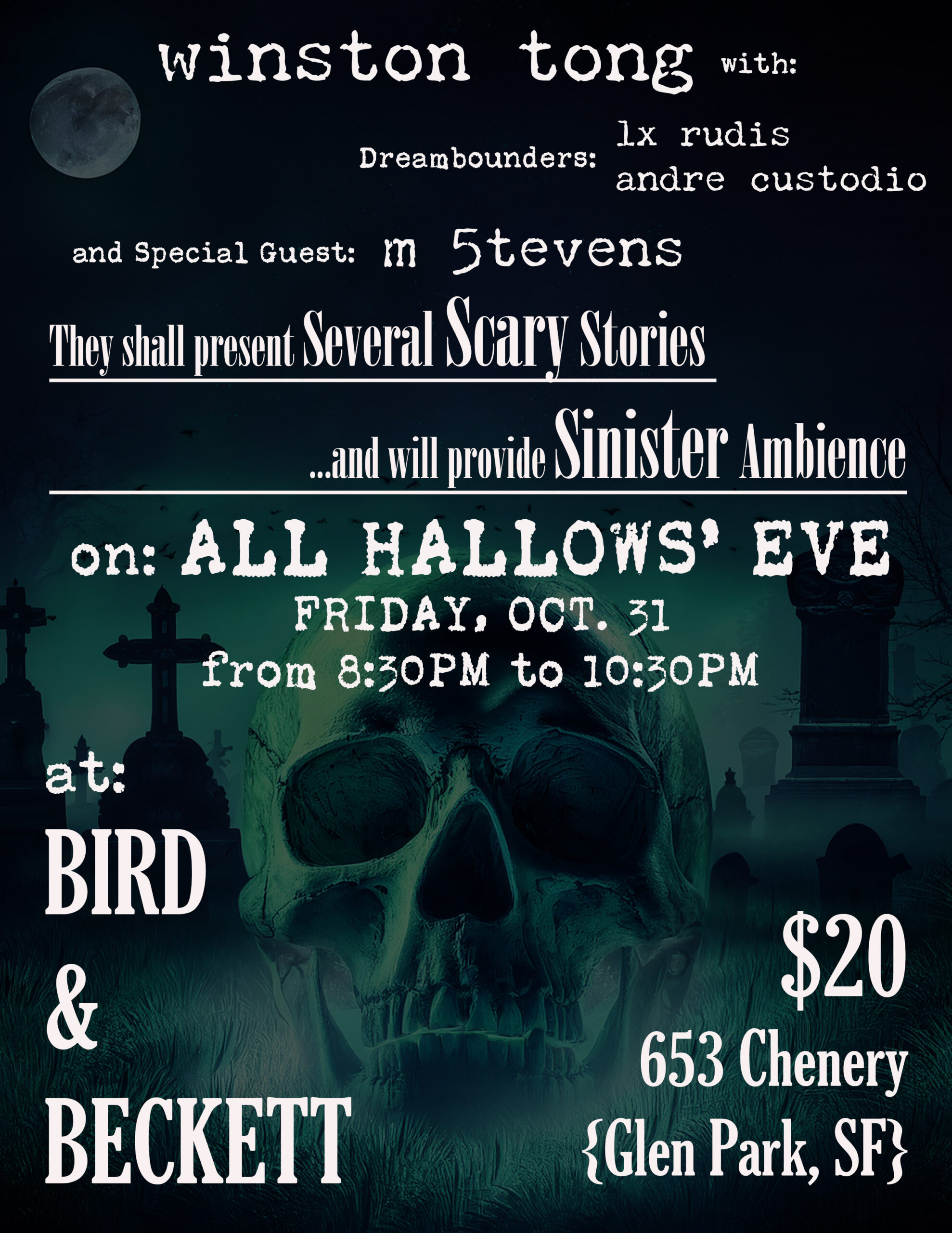 Read MoreSpend your spooky Halloween at Bird & Beckett! $20 cover charge per show / byob Eric & the In Crowd get Creepy at 6pm. Eric Shifrin, piano Paul Mehling, guitar Jim Kerwin, bass Winston Tong with Dreambounders (LX Rudis & Andre Custodio) plus M 5tevens at 8:30pm.