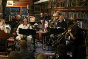 From the start in 1999, whenever we could save a few dimes from book sales to pay at least a token guarantee to the players, we presented the occasional combo. The first was a student trio helmed by Lee Bloom’s piano student Jon Anderson with his buddy Andrew Kelsey.