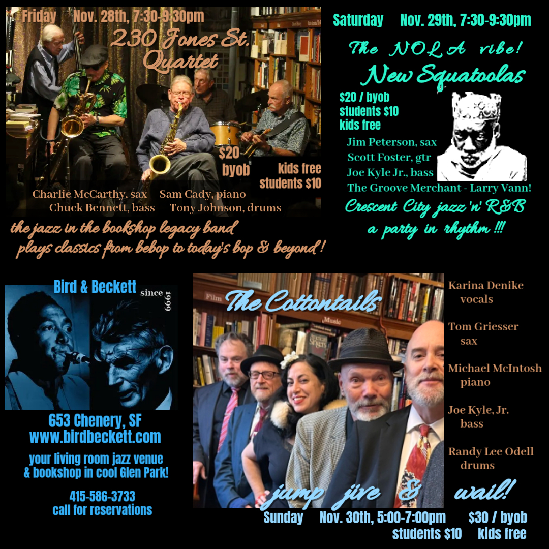 Saturday the 29th, again at 7:30pm, we’ll present the NOLA vibe of the New Squatoolas. It’s a Thanksgiving weekend tradition at Bird & Beckett that goes back years. Again, twenty gets you in ($10 for students, free for the little kids) and you can feel free to bring something to sip. Sax player Jim Peterson, guitarist Scott Foster, bassist Joe Kyle, Jr. and drummer Larry Vann have a magic way with the groove and a gusto that will keep your spirits riding high.