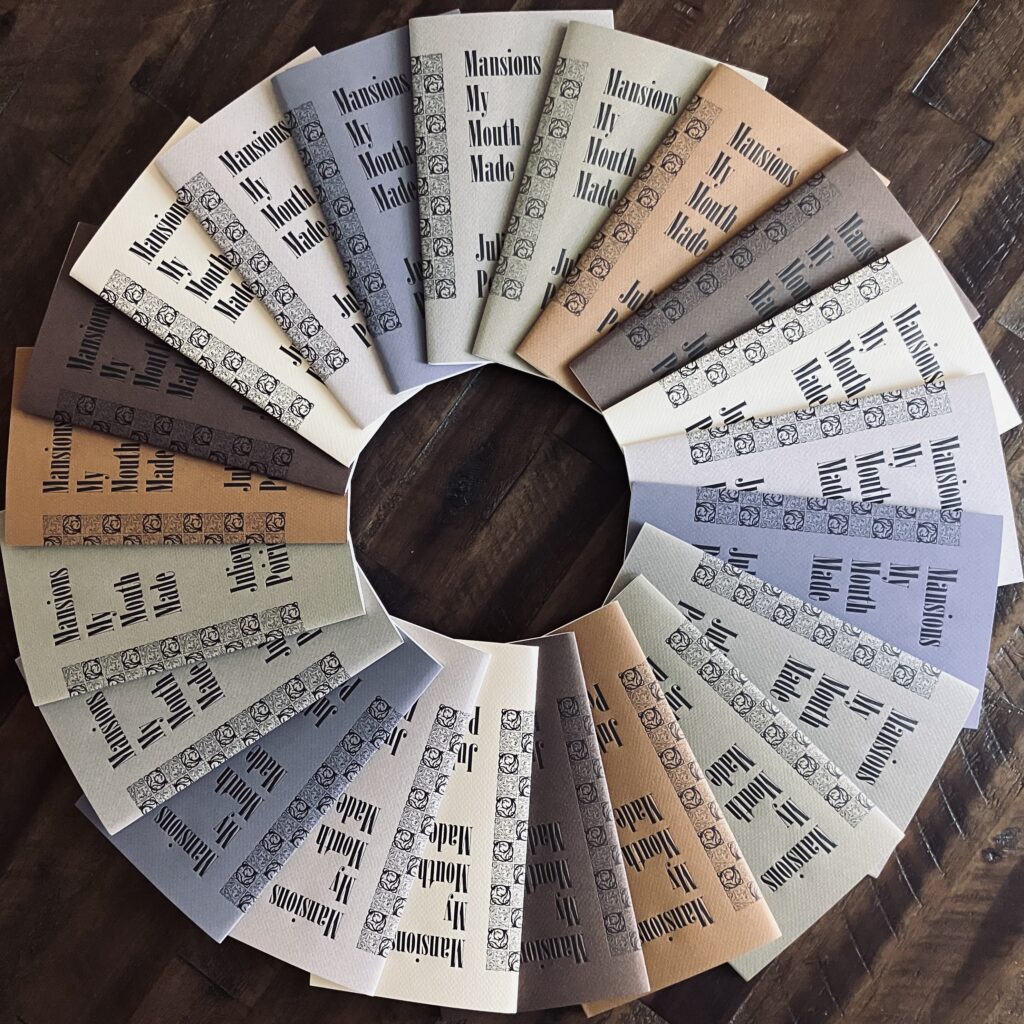 Copies of Julien Poirier’s Mansions My Mouth Made (Bird & Beckett, 2025) can be had over the counter at the bookshop and via post through the online store of Impart Ink, where the thing was designed, printed, and assembled: 32 pages, hand-sewn in wrappers printed letterpress from Onyx type on Canson papers in a variety of hues. Yours…