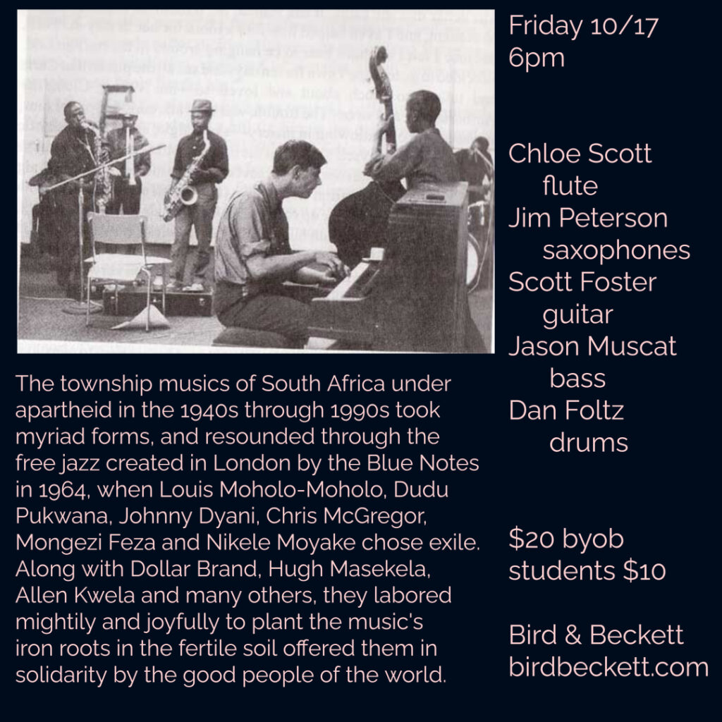 The Scott Foster Quintet dives into the South African jazz repertoire, playing the music of Allen Kwela, Dudu Pukwana, Johnny Dyani, Abdullah Ibrahim (Dollar Brand), Hugh Masekela and their countrymen. $25 cover charge requested, students $10.