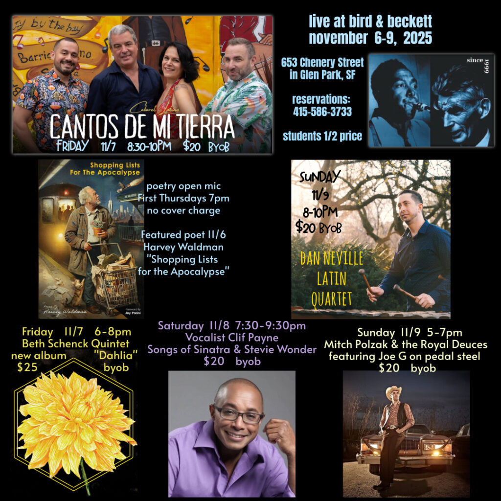 Thursday 11/6 at 7pm, poet Harvey Waldman reads from Shopping Lists for the Apocalypse, with an open mic to follow____Friday 11/7 at 6pm, Beth Schenck presents her new quintet album, “Dahlia,” with its all-star cast of avant garde colleagues____Friday 11/7 at 8:30pm, Latin cabaret ensemble Cantos De Mi Tierra holds forth_____Saturday 11/8 at 7:30pm, Clif Payne sings Sinatra & Wonder backed by a superb trio_____Sunday 11/9 at 5pm, Mitch Polzak and the Royal Deuces featuring pedal steel player Joe Goldmark rolls into the neighborhood… A