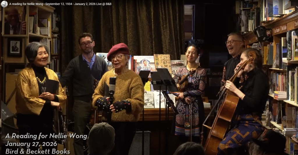 Nellie Wong (born September 12, 1934; died January 2, 2026) emerged as a brilliant poet with a lifelong commitment to radical feminism and socialist politics in the late 1960s and early 1970s. Born and raised in Oakland’s Chinatown at 723 Webster Street, she worked in her parents’ neighborhood restaurant throughout her youth, graduated from Oakland High School (sixth oldest high school in California and the oldest high school in Oakland, whose alumni include Julia Morgan, Gertrude Stein, Jack London, (Nellie, 1952), David Carradine, Ben Fong-Torres, Shirley Fong-Torres, Sheila E and Boots Riley), found secretarial work at Bethlehem Steel and, on Bethlehem’s dime, enrolled at San Francisco State University in the early 1970s, where her insight and vision, already acute, were fully activated. There, she joined Radical Women and the Freedom Socialist Party, remaining active in both until her death. Students at Oakland High voted to name a building on the campus for Nellie in 2010. In her writing career, Nellie was published in the anthology This Bridge Called My Back and there have been five collections of her work to date: Dreams in Harrison Railroad Park (1977), The Death of Long Steam Lady (1984), Stolen Moments (1997), Breakfast Lunch Dinner (2012) and Nothing Like Freedom (2024, on her 90th birthday), with a posthumous collection in the works. Poet, artist, activist, Nellie was an icon, a neighbor and a friend. Read a moving profile of Nellie written by her brother, the journalist William (Bill) Gee Wong at this link and listen to Nellie herself describe her youth and development in this interview. Tonight’s reading features Genny Lim and Flo Oy Wong, The Hoisan Poets, with the Del Sol Quartet; Kim Shuck, Robert Rubino, Alice Rogoff, Clara Hsu, Bill Vartnaw, devorah major and Gail Mitchell; organized by Kim Shuck and co-sponsored by the San Francisco Public Library.