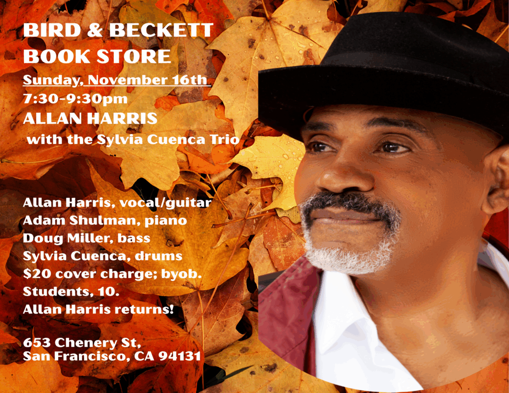 Earlier this year, in March, Allan was here at Bird & Beckett with a fantastic date based on “The Poetry of Jazz.” A cd of that music, recorded live in Ann Arbor, Michigan with a quintet including Sylvia Cuenca on drums, was released in July and now he’s coming back with a superb trio for an exquisite night of music.