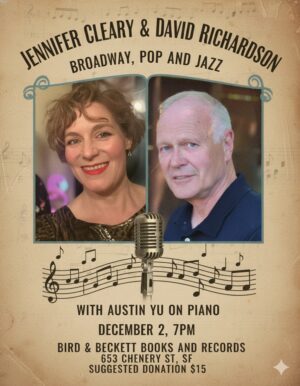 David is a long time Glen Park resident, and Bird and Beckett shopper. He’s been acting in local theatre productions for years and was most recently seen as Sir Andrew Aguecheek  in a production of Twelfth Night at The Eclectic Box Theatre in the Mission District.  Singing, however, is much more recent, and this is David’s first full show.  It’s all a work in progress! David’s major talent is always in finding the best teachers, from Rodney Keuhne in high School, to the late Linda Lowry, to Mary Argenti at CCSF, to Nena Aldaz, and the multi-talented Clif Payne at San Francisco Community Music Center.  David notes that “Glen Park is fortunate to have the great community resource that is Bird and Beckett, and I am appreciative of Eric for this great opportunity.”